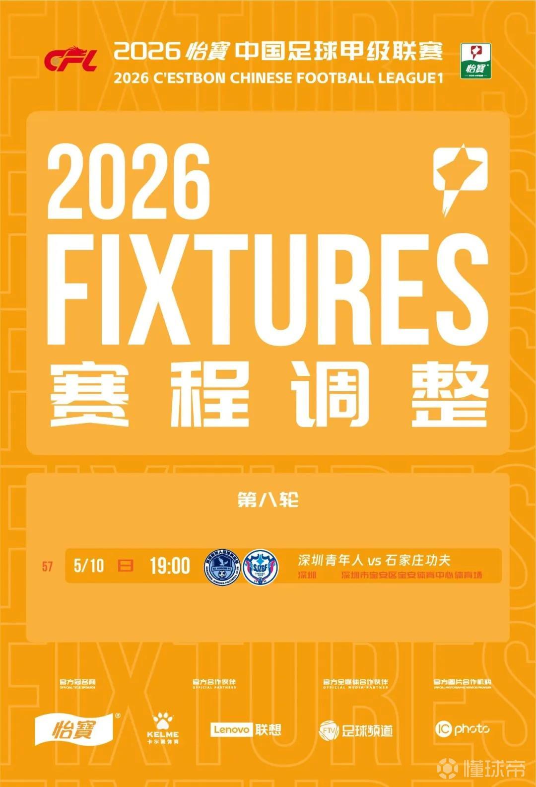 根據(jù)2026怡寶中甲聯(lián)賽賽程,深圳青年人對陣石家莊功夫的比賽原定于5月9日19:00進行。因舉辦大型活動,為確保賽事安全有序進行,經(jīng)深圳青年人足球俱樂部和賽區(qū)聯(lián)合申請,并協(xié)商客隊俱樂部及有關(guān)方同意,現(xiàn)決定調(diào)整深圳青年人對陣石家莊功夫的比賽日期,其他比賽安排不變。