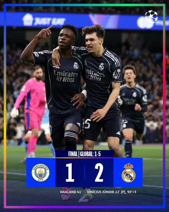 北京時(shí)間3月18日凌晨4點(diǎn),歐冠八分之一決賽次回合較量,首回合3球落敗的曼城主場(chǎng)迎戰(zhàn)皇家馬德里。上半場(chǎng)比賽,B席門前手肘擋出維尼修斯絕佳良機(jī)被直紅罰下,且送出點(diǎn)球,維尼修斯主罰命中,將總比分?jǐn)U大至4比0,隨后哈蘭德后點(diǎn)打空門扳回一城。下半場(chǎng)比賽,多納魯馬化解單刀,多庫(kù)、艾特·努里,巴爾韋德和維尼修斯四人進(jìn)球無(wú)效,補(bǔ)時(shí)階段,楚阿梅尼助攻維尼修斯完成雙響。最終,皇家馬德里客場(chǎng)2比1、總比分5比1雙殺曼城,打進(jìn)歐冠8強(qiáng)。