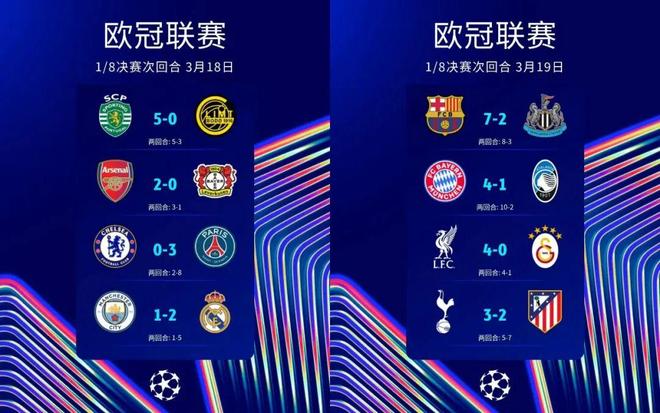 北京時(shí)間3月19日,歐冠1/8決賽次回合最后四次對(duì)決結(jié)束。本輪,英超球隊(duì)遭遇重創(chuàng),切爾西、曼城分別遭巴黎、皇馬雙殺出局,熱刺雖主場(chǎng)險(xiǎn)勝馬競(jìng)?cè)蕴羁蛨?chǎng)慘敗大坑,首回合主場(chǎng)戰(zhàn)平巴薩的紐卡斯?fàn)柭?lián)則在客場(chǎng)2比7慘遭屠戮——除阿森納輕取勒沃庫(kù)森獲得晉級(jí)門票外,僅利物浦主場(chǎng)四球大勝加拉塔薩雷逆轉(zhuǎn)總比分晉級(jí);西甲三強(qiáng)則全部晉級(jí)8強(qiáng),展現(xiàn)底蘊(yùn);葡萄牙體育常規(guī)時(shí)間3比0、總比分3比3戰(zhàn)平博德閃耀進(jìn)入加時(shí)賽,加時(shí)賽葡體再進(jìn)2球,完成神奇逆轉(zhuǎn)送黑馬出局;拜仁則再送意甲獨(dú)苗亞特蘭大一場(chǎng)慘敗,總比分10比2輕松過關(guān)。