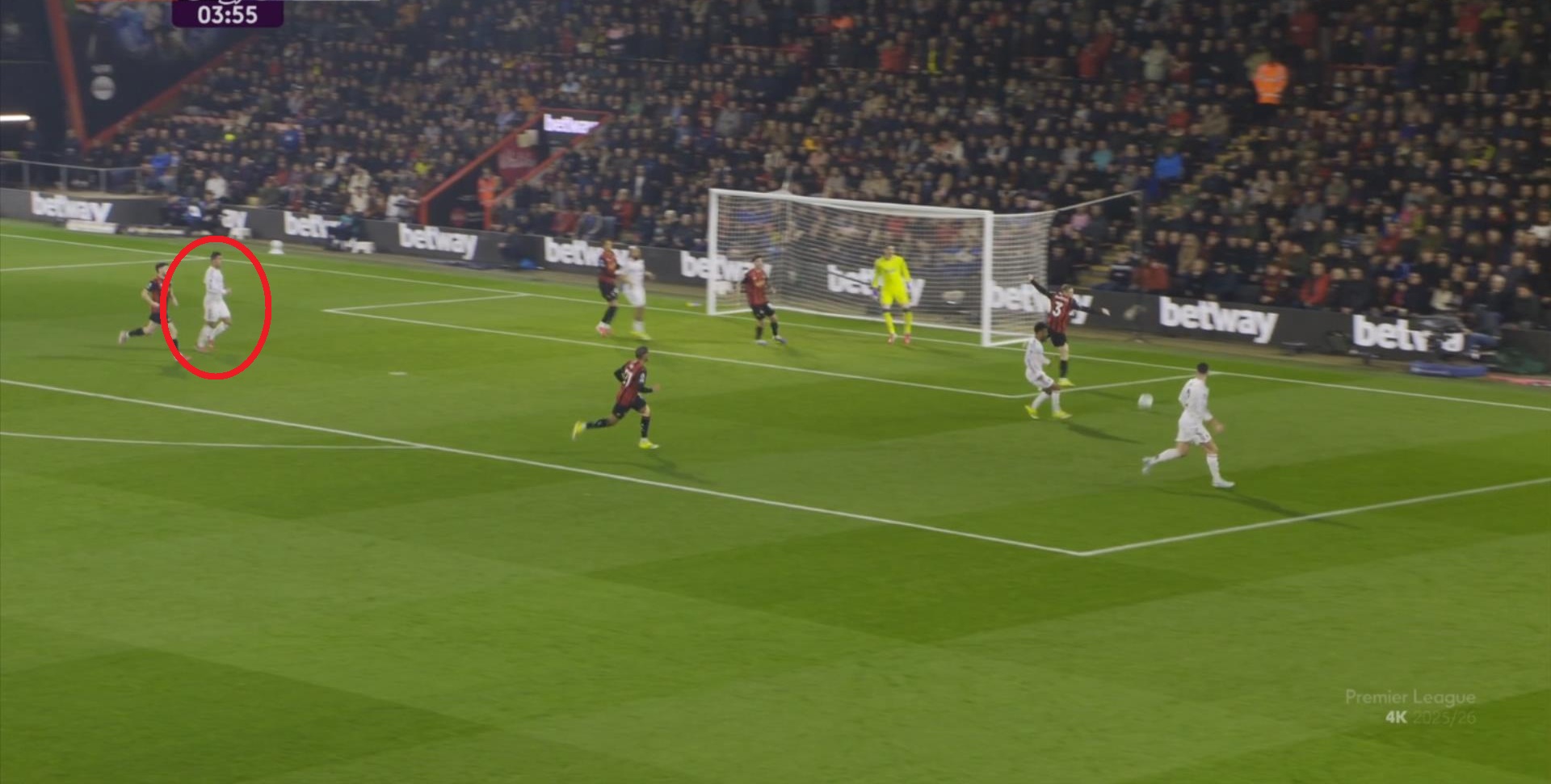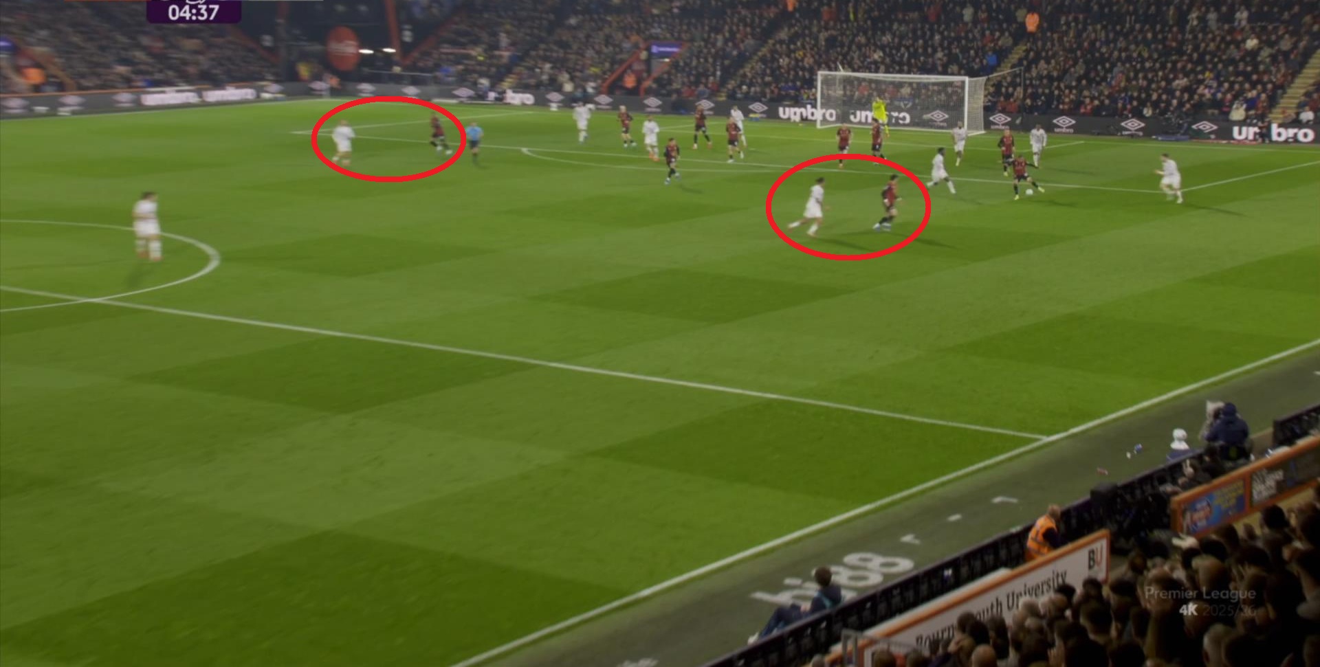 這個(gè)時(shí)候,曼聯(lián)想要打出優(yōu)勢(shì),就需要找其中還能勉力維持的點(diǎn)位,這個(gè)點(diǎn)位就是庫(kù)尼亞,一方面他的確是比較全面,所以身體撐得住技術(shù)的基本發(fā)揮,另一方面就是他對(duì)位的伯恩茅斯右后衛(wèi)阿萊士-希門尼斯比較弱,所以在這個(gè)一對(duì)一里,曼聯(lián)可以打出優(yōu)勢(shì),從而形成局勢(shì)上的平衡,甚至是反超: