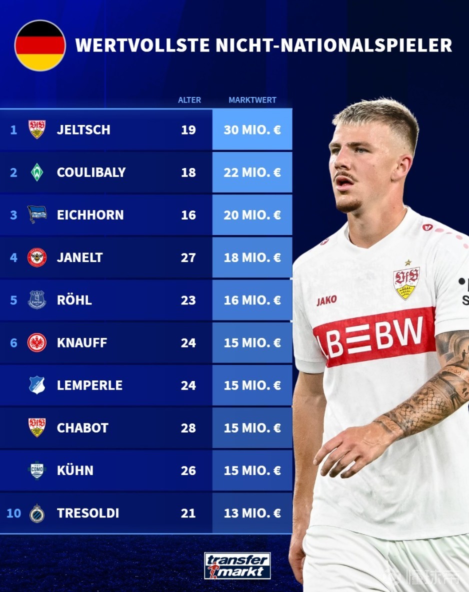 在德轉(zhuǎn)公布的身價榜單中,斯圖加特的19歲球員耶爾奇以3000萬歐元居首;不萊梅的庫利巴利以2200萬歐元位居第二;來自柏林赫塔的16歲小將艾?;舳饕?span lang="EN-US">2000萬歐元排名第三。