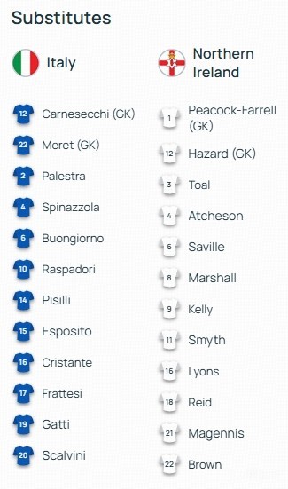 北京時間3月27日03:45,歐洲預(yù)選附加賽半決賽的一場較量。意大利對陣北愛爾蘭。賽前,雙方的陣容公布如下: