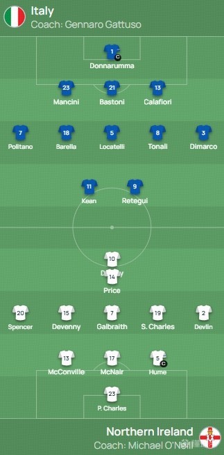 意大利首發(fā):1-多納魯馬、23-曼奇尼、21-巴斯托尼、13-卡拉菲奧里、7-波利塔諾、18-巴雷拉、5-洛卡特利、8-托納利、3-迪馬爾科、11-基恩、9-雷特吉