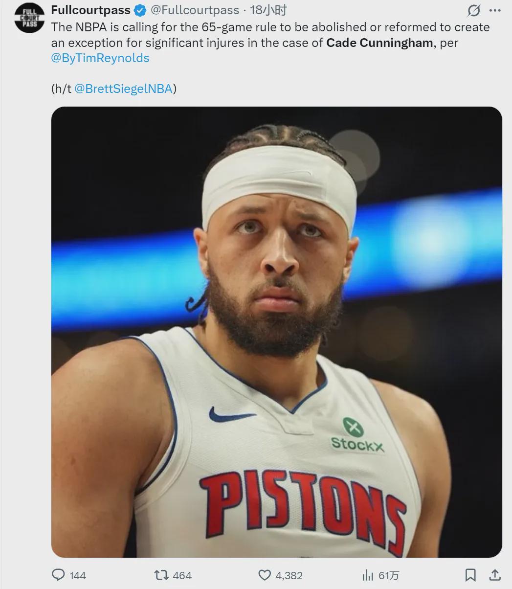 經(jīng)紀(jì)人為自己的客戶打抱不平,也在情理之中。值得一提的是,NBA球員工會發(fā)言人也為坎寧安發(fā)聲,呼吁廢除65場評獎條件:“自該規(guī)則實施以來,已有太多當(dāng)之無愧的球員因這一武斷的場次要求,被不公正地剝奪榮譽(yù)的評選資格?!?/p>