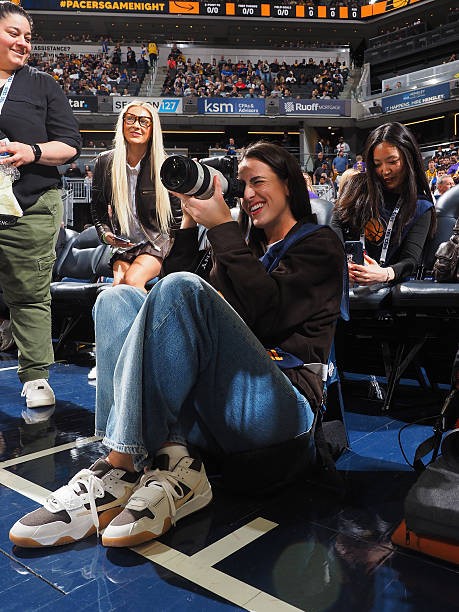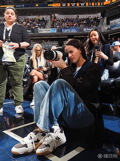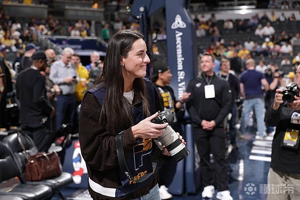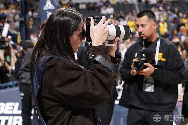 本場(chǎng)比賽,WNBA印第安納狂熱球星克拉克現(xiàn)場(chǎng)觀賽,并擔(dān)任場(chǎng)邊攝影記者,她身著攝影記者馬甲,手持搭配G大師70-200的索尼相機(jī)在場(chǎng)邊攝影區(qū)進(jìn)行拍攝。