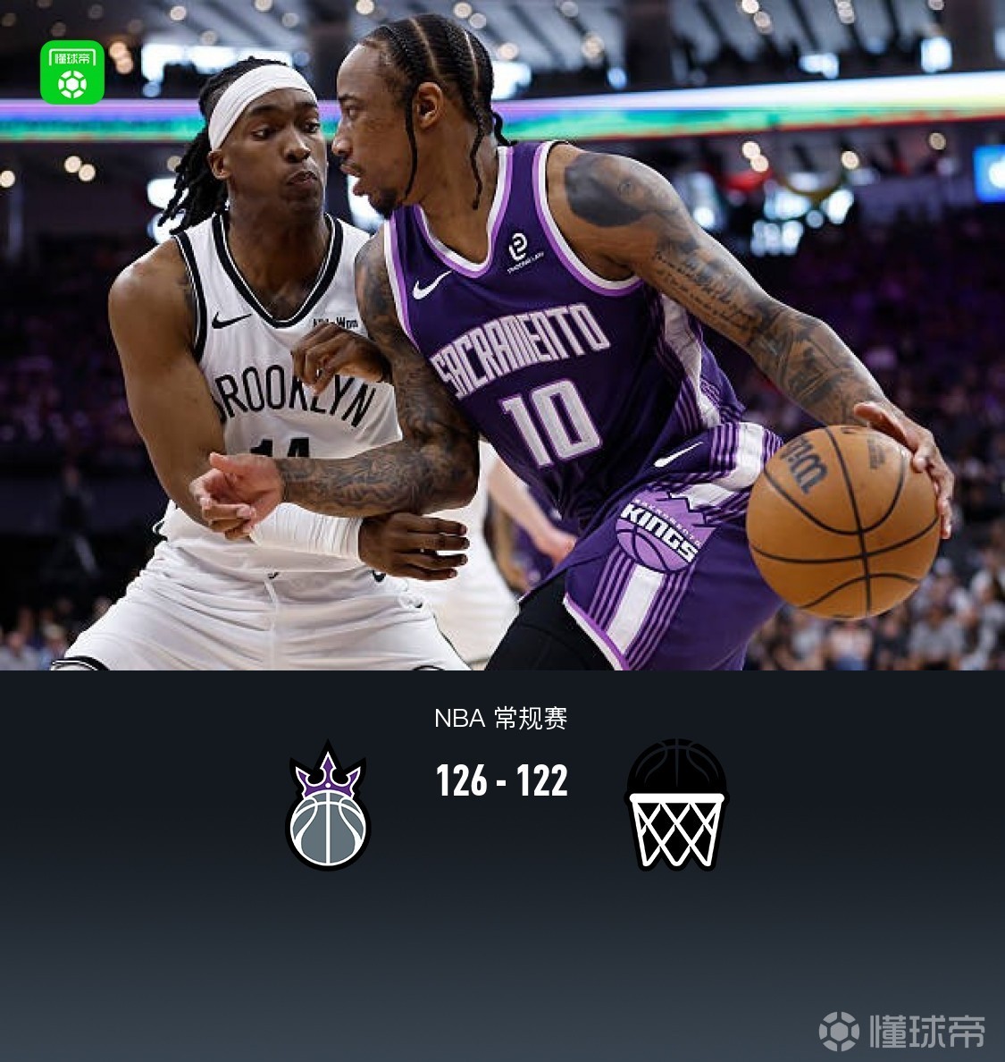 第四節(jié)國王蒙克拿下12分,籃網(wǎng)薩拉夫拿下12分,最終國王126-122戰(zhàn)勝籃網(wǎng)