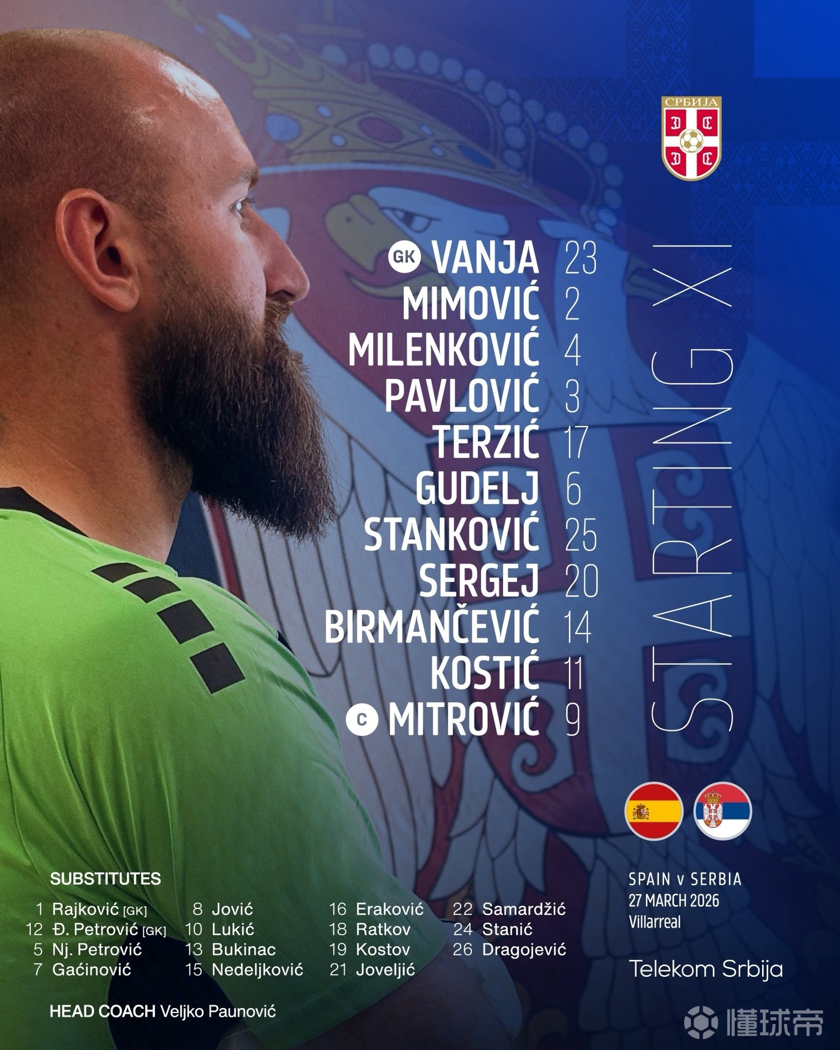 塞爾維亞首發(fā):23-瓦尼亞-米林科維奇、4-米倫科維奇、3-帕夫洛維奇、17-泰爾齊奇、2-米莫維奇、25-斯坦科維奇、6-古德利、11-科斯蒂奇、20-米林科維奇、14-比爾曼切維奇、9-米特羅維奇