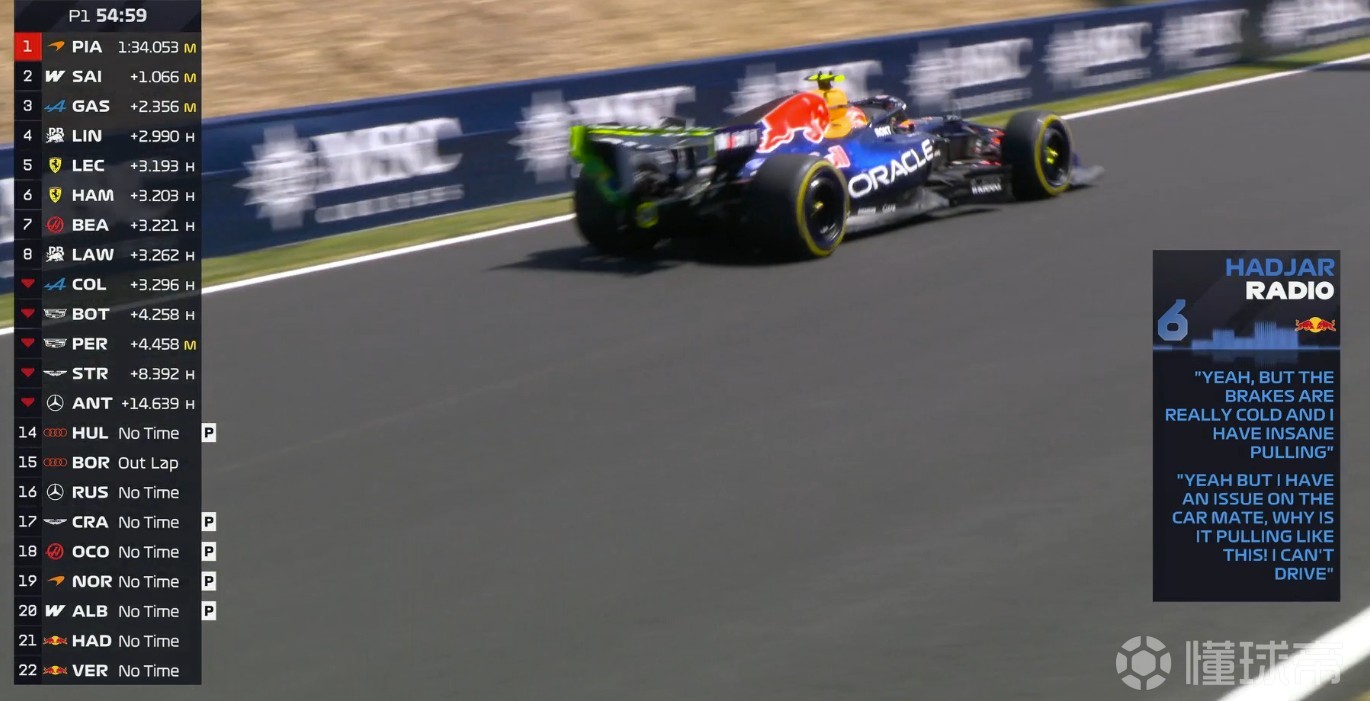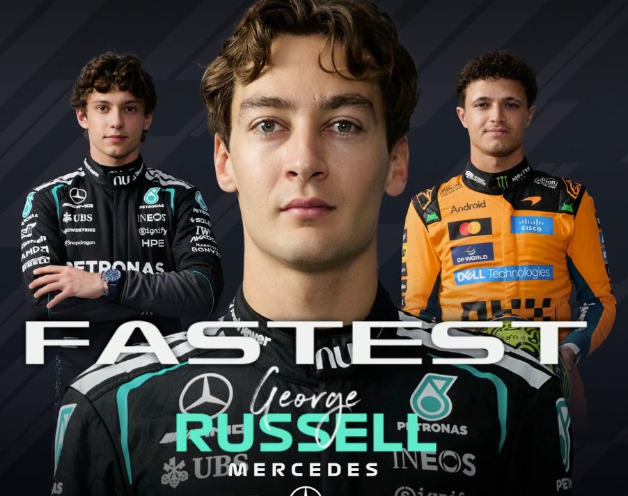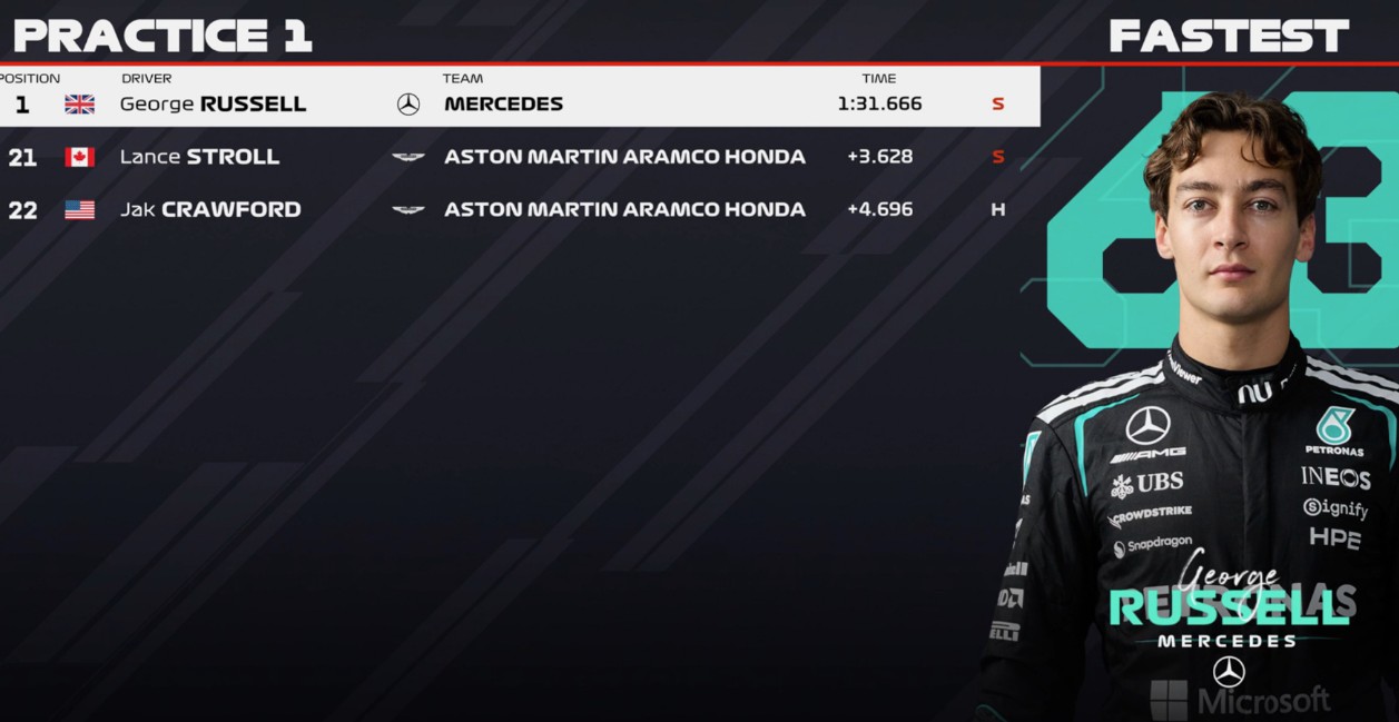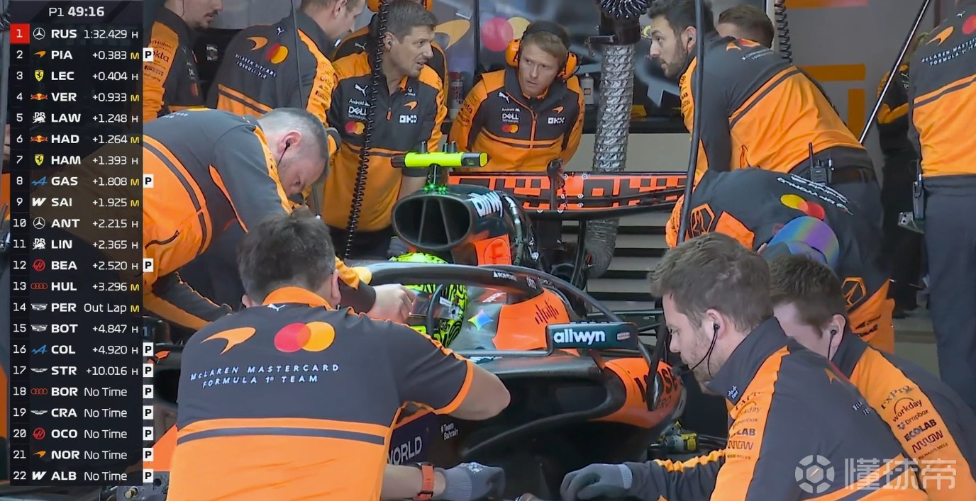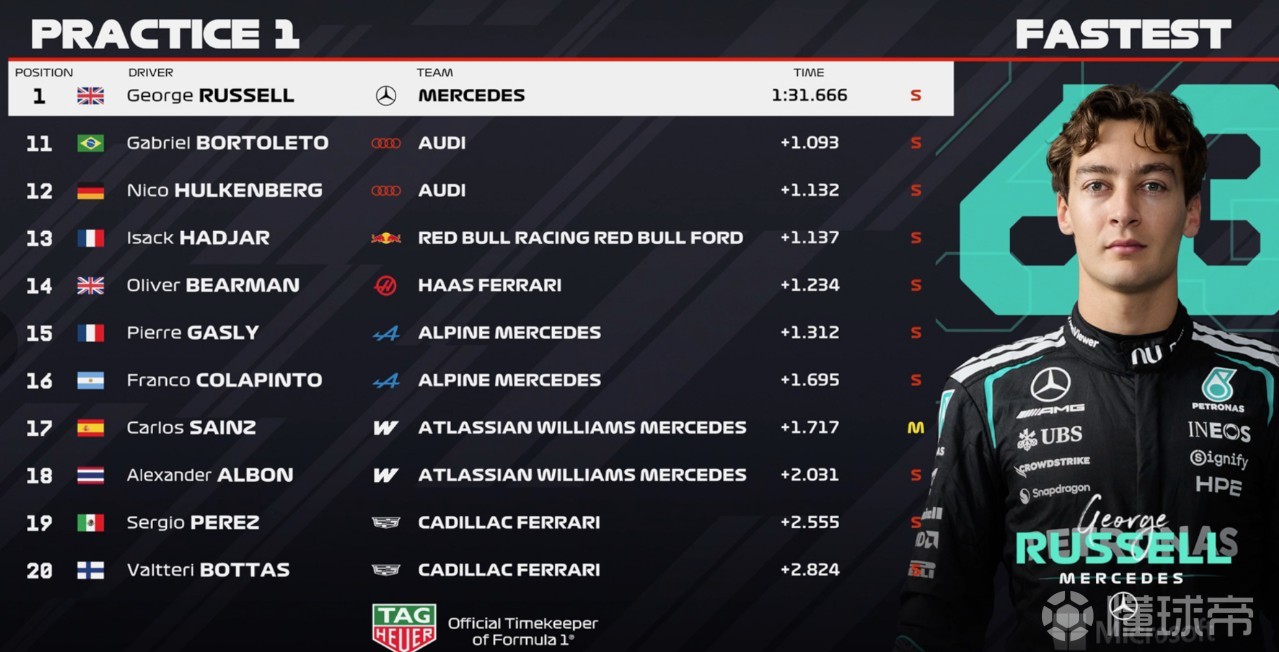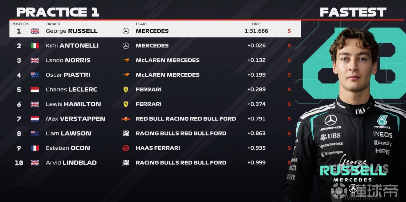 一練停表,拉塞爾全場最快,安東內(nèi)利第二,邁凱倫三四,法拉利五六,維斯塔潘第七。