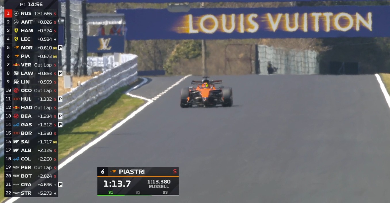 北京時(shí)間3月27日,F(xiàn)1日本站一練,拉塞爾全場最快,安東內(nèi)利第二,邁凱倫三四,法拉利五六,維斯塔潘第七,勞森第八,奧康第九,林德布拉德第十。