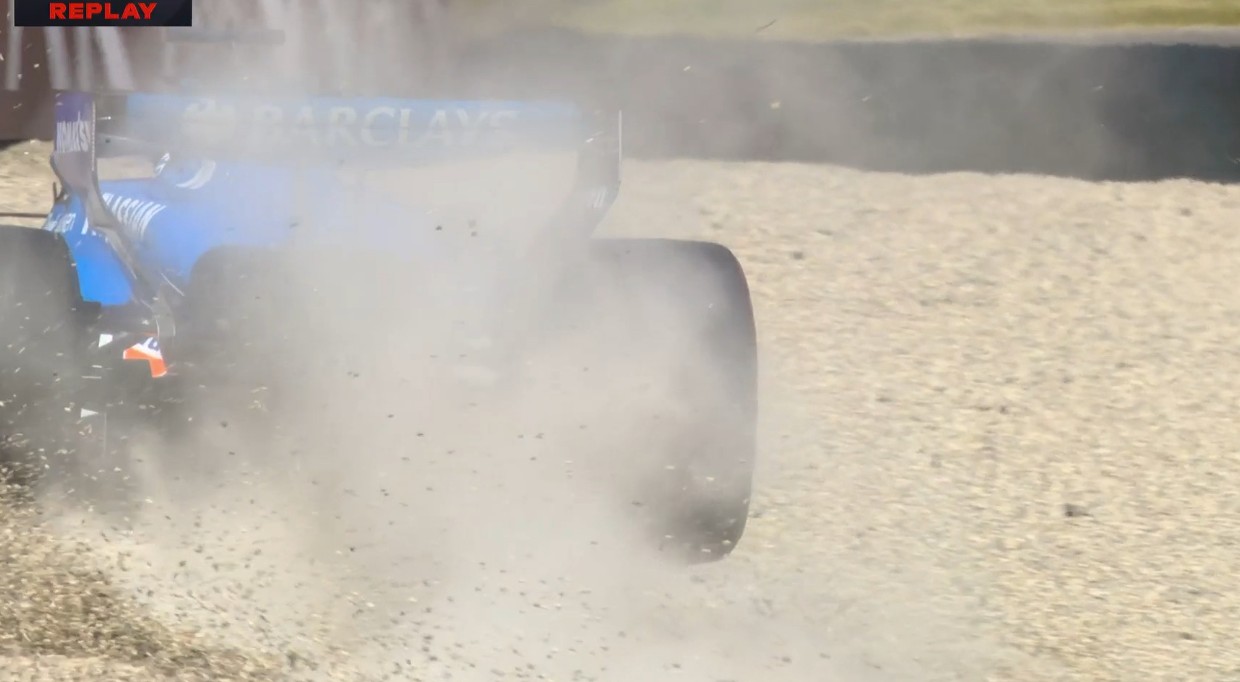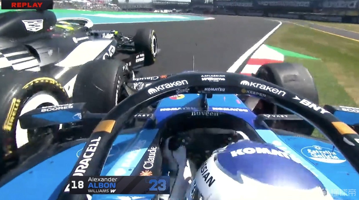 阿爾本在9號彎沖入了砂石區(qū),后輪似乎與墻有碰撞。