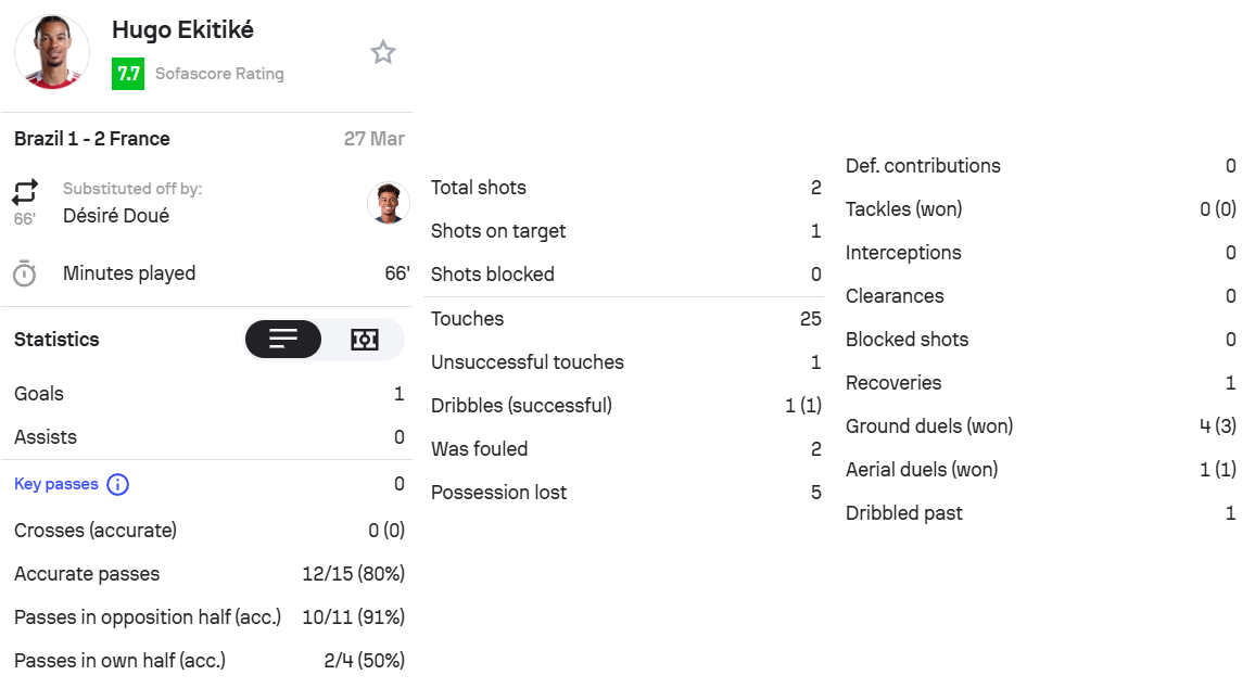 埃基蒂克本場比賽首發(fā)出場66分鐘,進(jìn)1球,獲評7.7分。