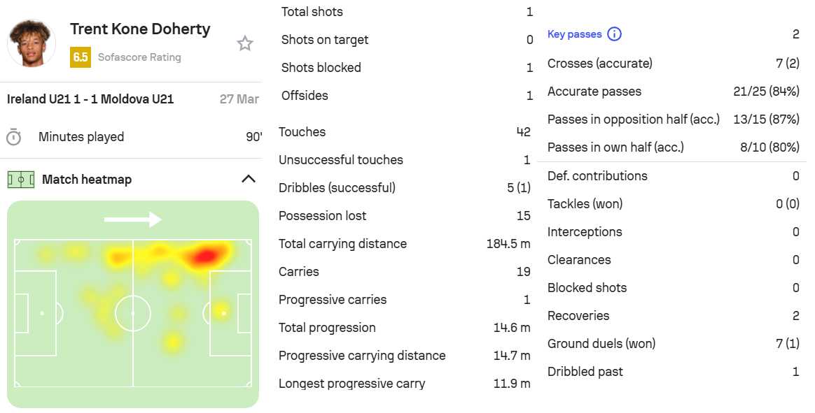 2.多赫蒂,愛爾蘭U21 1-1 摩爾多瓦U21,首發(fā)打滿全場。