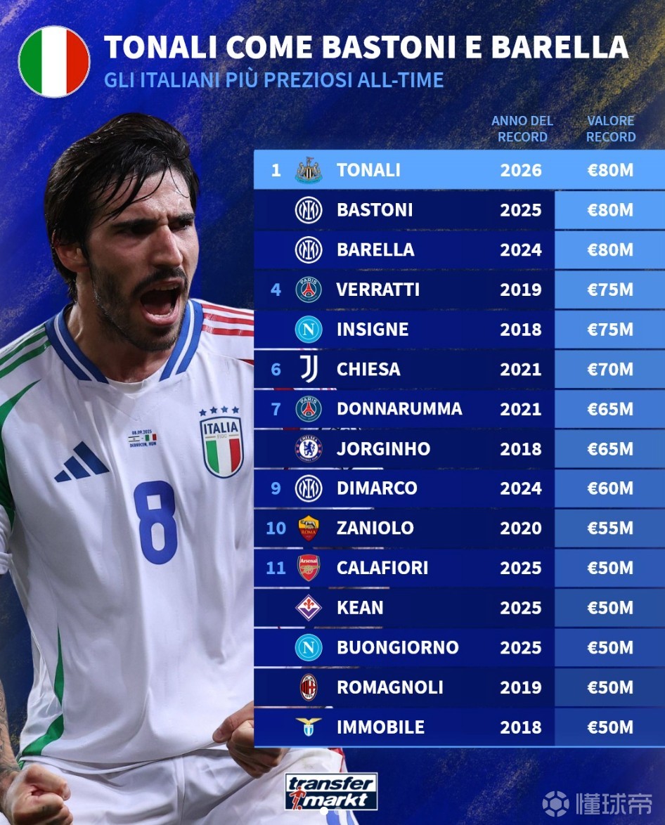 北京時(shí)間3月27日,在世預(yù)賽歐洲區(qū)附加賽半決賽中,托納利貢獻(xiàn)的一射一傳幫助意大利2-0淘汰北愛(ài)爾蘭,賽后德轉(zhuǎn)統(tǒng)計(jì)出了意大利球員歷史身價(jià)榜,托納利與巴斯托尼、巴雷拉同以8000萬(wàn)歐元并列第一。