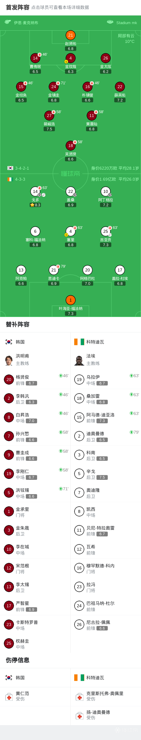 北京時(shí)間3月28日國(guó)際友誼賽,韓國(guó)對(duì)陣科特迪瓦。戈多傳射、蓋桑、阿丁格拉、辛戈破門。最終比分韓國(guó) 0-4 科特迪瓦。