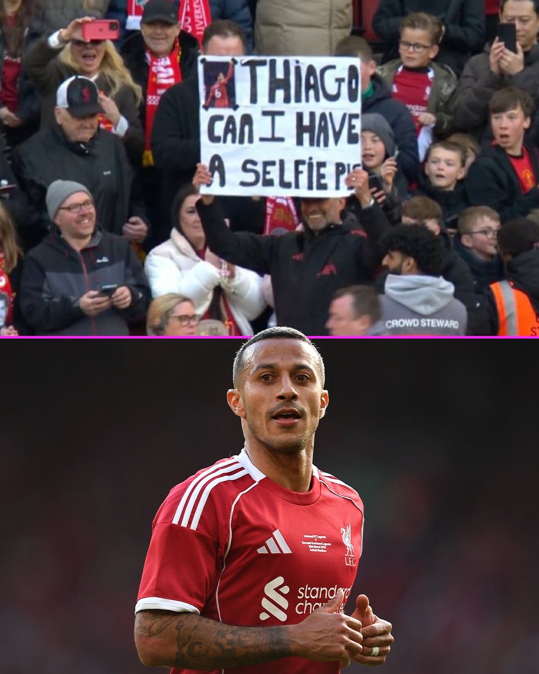 現(xiàn)場球迷拍攝到,克洛普高舉一塊手寫標語牌,向昔日弟子蒂亞戈發(fā)出合影邀約,牌面清晰寫著:“蒂亞戈,能和我合張影嗎?”