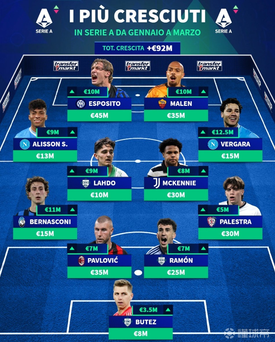 北京時間3月29日,在更新了意甲球員的身價之后,德轉(zhuǎn)列出了此次更新身價上漲最佳11人陣容,皮奧-埃斯波西托領(lǐng)銜,馬倫、麥肯尼、帕夫洛維奇在列。