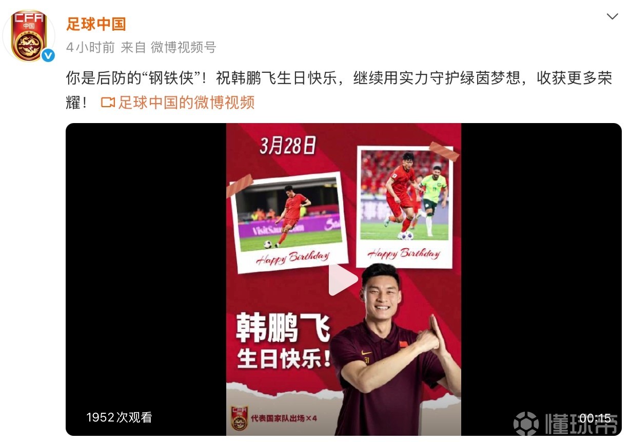 官方在今天上午發(fā)文表示:你是后防的“鋼鐵俠”!祝韓鵬飛生日快樂,繼續(xù)用實(shí)力守護(hù)綠茵夢想,收獲更多榮耀!