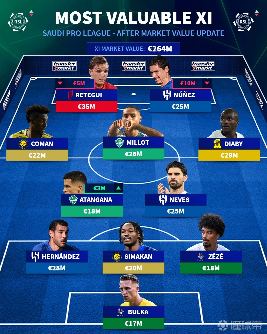 北京時間3月30日,德國轉會市場公布了沙特球員的最新身價,隨后,他們列出了各個位置身價最高球員的最佳陣容,其中,雷特吉、努涅斯、科曼、特奧、魯本-內維斯在列。