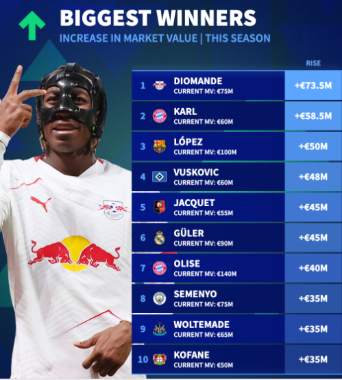 在3月份的更新完成后,該媒體特意盤點(diǎn)了一下本賽季五大聯(lián)賽球員中,誰的身價(jià)漲幅最驚人。