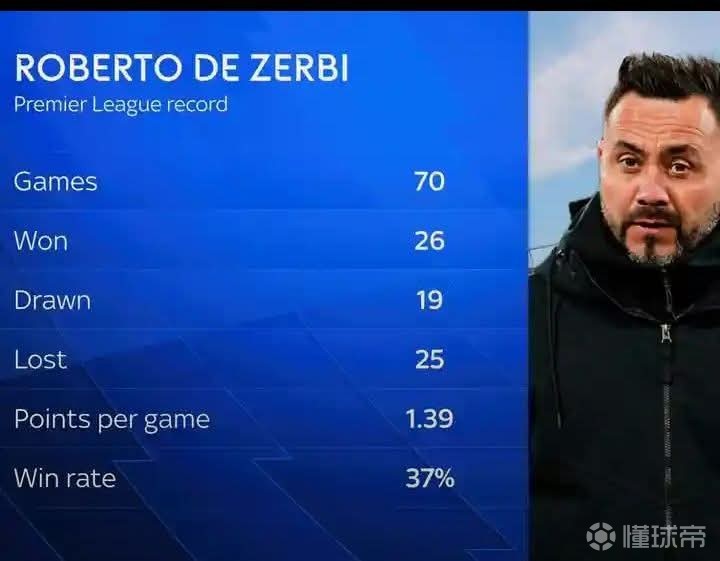 現(xiàn)年46歲的德澤爾比2022年9月至2024年6月曾經(jīng)執(zhí)教過布萊頓,期間他率隊在英超出戰(zhàn)了70場比賽,總成績?yōu)?6勝19平25負,場均積分為1.39分,勝率為37%。