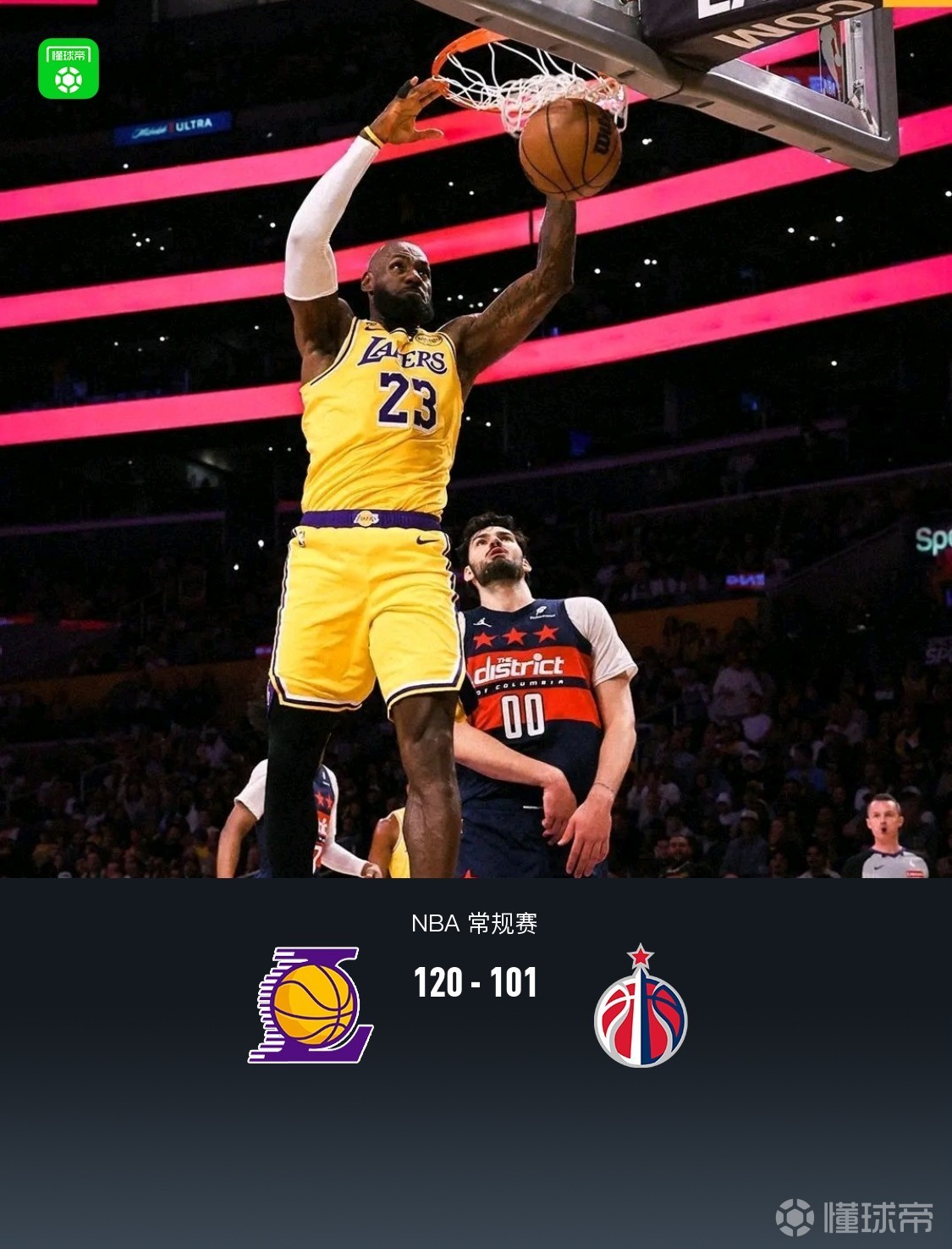 第四節(jié),開節(jié)湖人詹姆斯、海斯聯(lián)手迅速領(lǐng)先至20分以上,隨后肯納德、八村壘中遠(yuǎn)投繼續(xù)得分領(lǐng)先至30分,比賽逐漸進(jìn)入練兵時(shí)間,最終湖人120-101戰(zhàn)勝奇才。