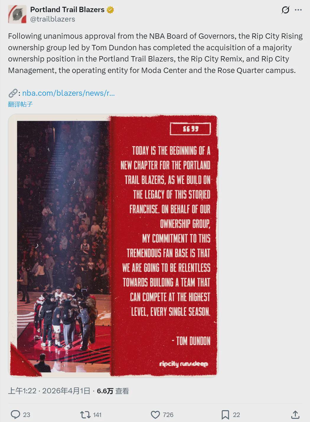 這件事并非NBA調(diào)查出來的,而是開拓者主動上報,所以聯(lián)盟處罰并不重。很多球迷不理解:開拓者是不是傻?為啥要找著被罰?這事還得結(jié)合另外一條新聞:4月1日開拓者官宣,聯(lián)盟董事會已經(jīng)批準(zhǔn),湯姆-鄧頓領(lǐng)銜的投資集團完成對開拓者的收購。