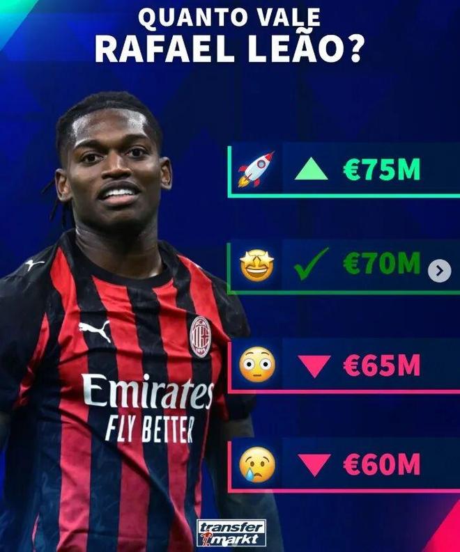 德國轉(zhuǎn)會市場即將更新意甲球員身價(jià),官方社媒預(yù)熱瞭米蘭球員萊奧的身價(jià)調(diào)整選項(xiàng)數(shù)字。