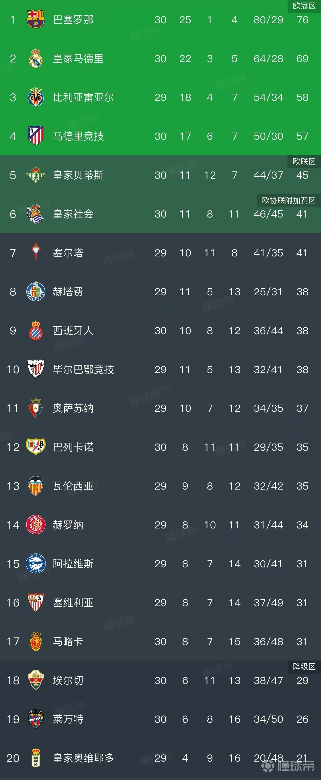 從第五名的皇家貝蒂斯(45分)開始,積分差距非常微?。坏诹始疑鐣?huì)積41分;第七名塞爾塔也積41分。對(duì)于歐聯(lián)杯及歐協(xié)聯(lián)資格的爭(zhēng)奪,將進(jìn)入白熱化階段。