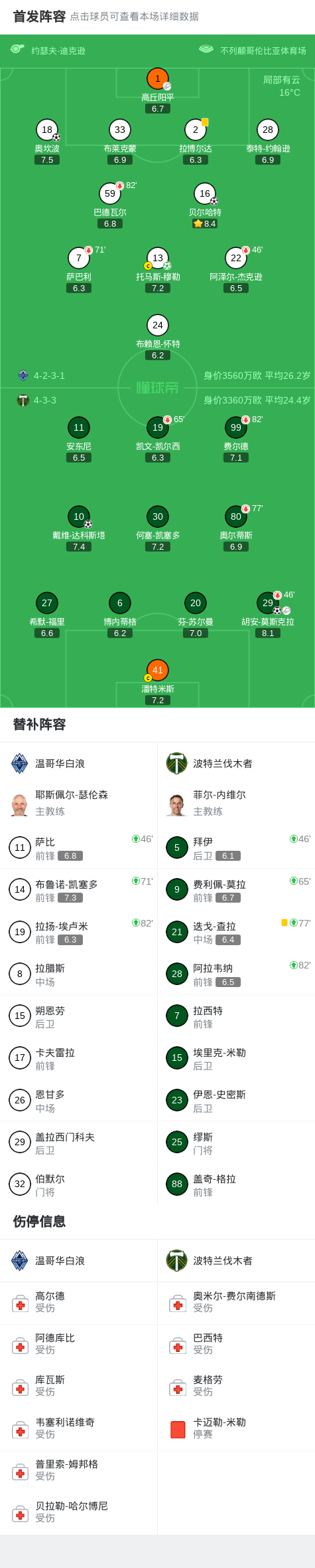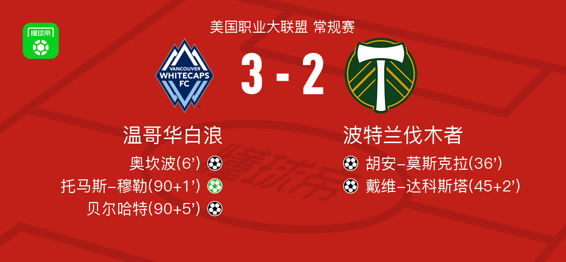 北京時間4月5日美國職業(yè)大聯(lián)盟 常規(guī)賽,溫哥華白浪主場對陣波特蘭伐木者。溫哥華白浪奧坎波破門,貝爾哈特破門,托馬斯-穆勒破門。波特蘭伐木者胡安-莫斯克拉破門,戴維-達(dá)科斯塔破門。最終比分溫哥華白浪 3-2 波特蘭伐木者。