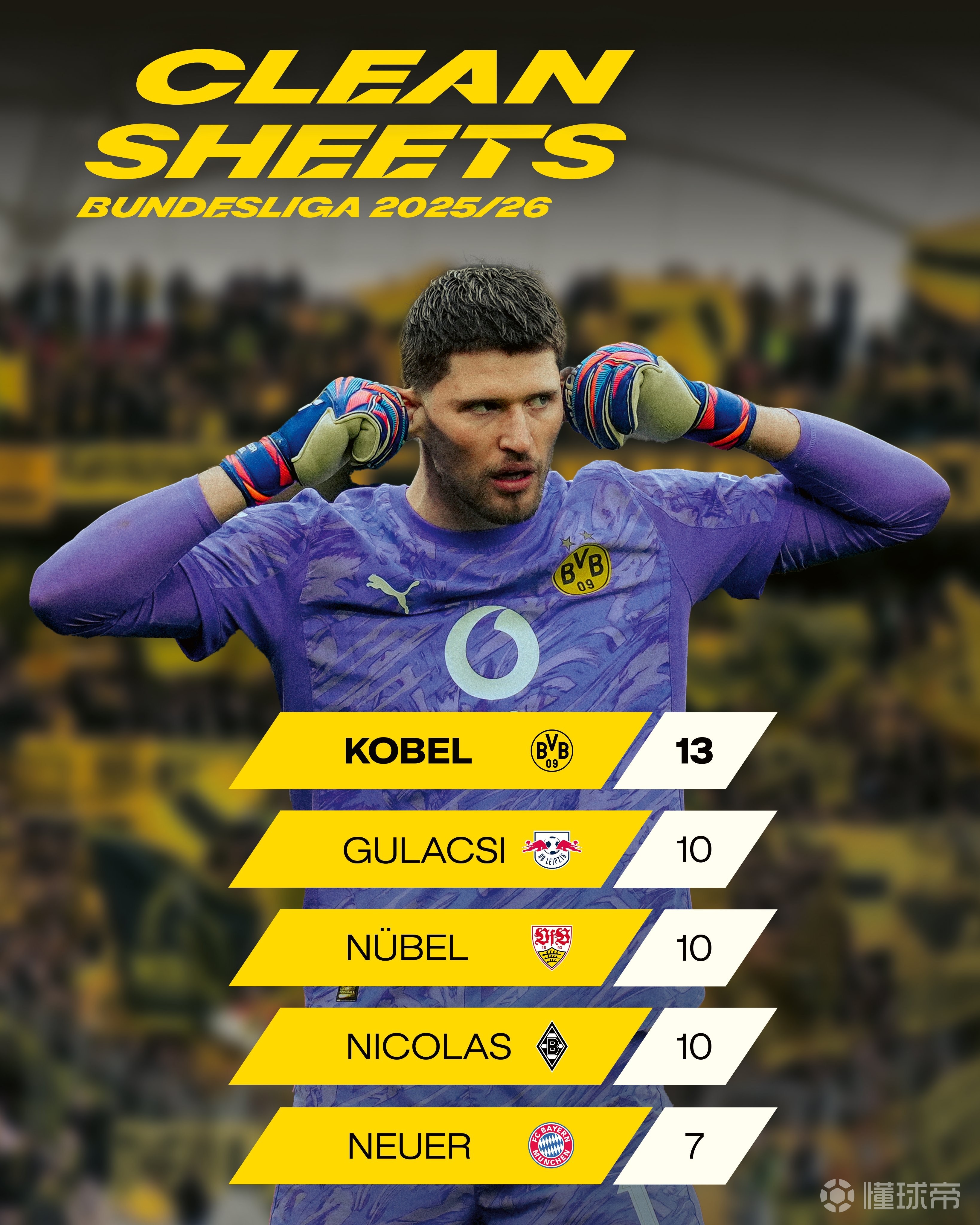 北京時間4月6日,多特官方發(fā)布了本賽季德甲門將零封榜單,其中多特門將科貝爾排名第一。