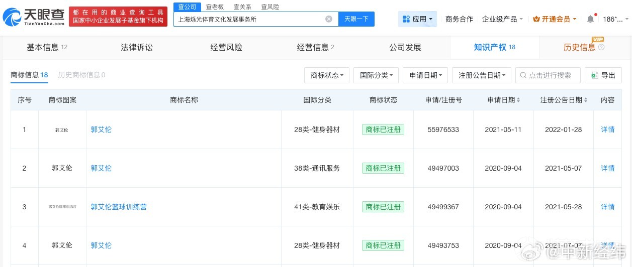 目前該事務(wù)所已注銷(xiāo)。知識(shí)產(chǎn)權(quán)信息顯示,該企業(yè)已注冊(cè)多枚“郭艾倫”“郭艾倫籃球訓(xùn)練營(yíng)”商標(biāo),國(guó)際分類(lèi)涉及健身器材、通訊服務(wù)、教育娛樂(lè)等,當(dāng)前商標(biāo)狀態(tài)多為已注冊(cè)。