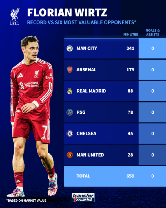 令人難以置信的是,維爾茨和?;倏嗽诿鎸@六支球隊(duì)時(shí),兩人合計(jì)出場1153分鐘,竟然沒有貢獻(xiàn)任何進(jìn)球或助攻。