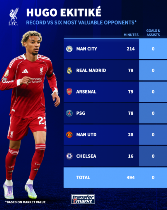 有意思的是,薩拉赫本賽季對陣這六個(gè)強(qiáng)敵時(shí)也還沒有進(jìn)球或助攻入賬,但埃及人畢竟已經(jīng)到了職業(yè)生涯末期,而且他在利物浦效力期間強(qiáng)強(qiáng)對話中的表現(xiàn)是有目共睹的。