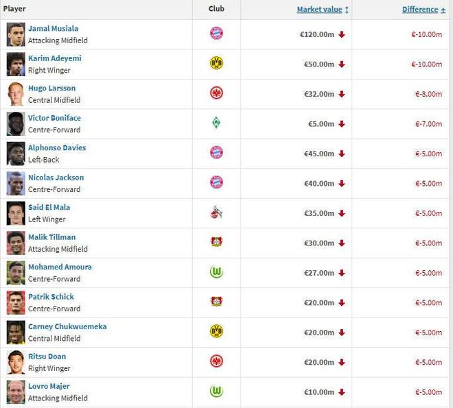 北京時間3月20日,德國轉(zhuǎn)會市場公布了德甲球員的最新身價,其中穆西亞拉、阿德耶米的身價下跌了1000萬歐元,為本期身價跌幅最大的球員。