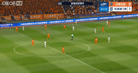 第41分鐘,王政豪后場起長傳,基萊斯單刀破門,云南玉昆0-1天津津門虎。