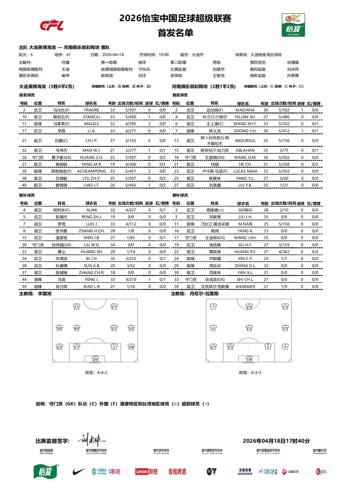 北京時(shí)間4月18日19:00,中超第6輪繼續(xù)進(jìn)行,大連英博坐鎮(zhèn)大連梭魚(yú)灣足球場(chǎng)迎戰(zhàn)河南,本場(chǎng)主裁判為何鑫,VAR裁判為王迪,賽前雙方首發(fā)出爐。