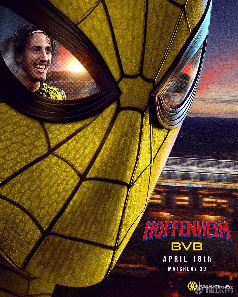 北京時間4月18日,多特蒙德發(fā)布了德甲第30輪對陣霍芬海姆的賽前海報,主題為蜘蛛俠。