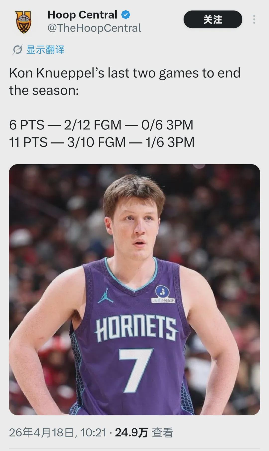 如果算上常規(guī)賽最后4場(chǎng)比賽,過去6場(chǎng)克尼佩爾場(chǎng)均10.8分4.5籃板2.7助攻,三分合計(jì)42中10,三分命中率只有23.8%。本賽季絕大部分時(shí)間,克尼佩爾發(fā)揮都非常穩(wěn)定。萬萬沒想到,常規(guī)賽收官階段和附加賽,他突然外線失準(zhǔn)了。