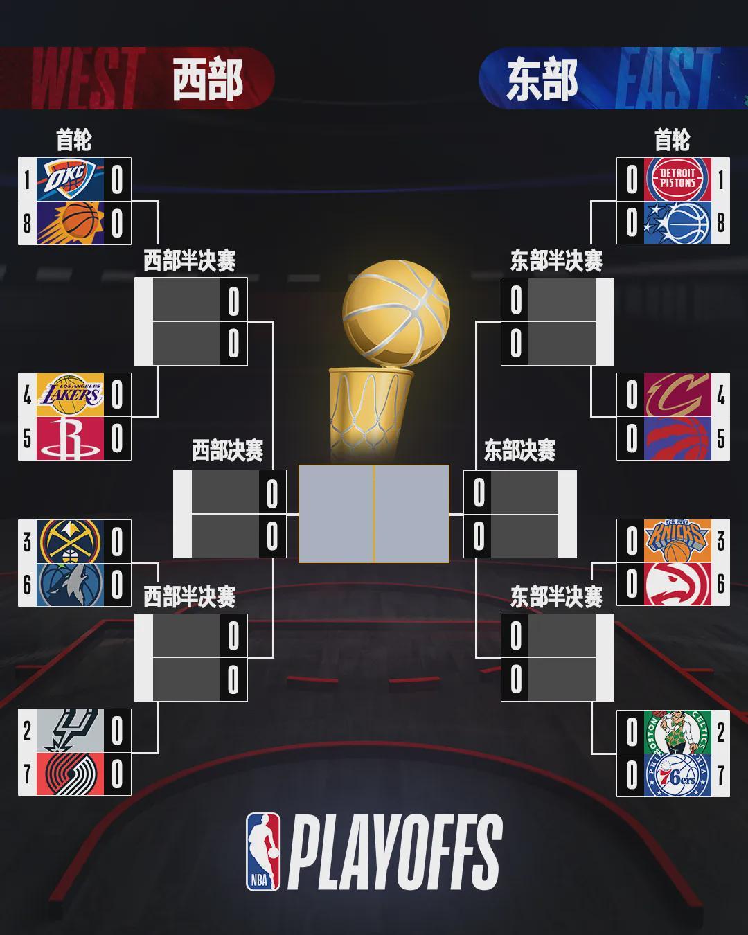 最后來看看季后賽完整對(duì)陣,明天凌晨1點(diǎn)季后賽首輪開打。你覺得哪兩支球隊(duì)能會(huì)師總決賽?