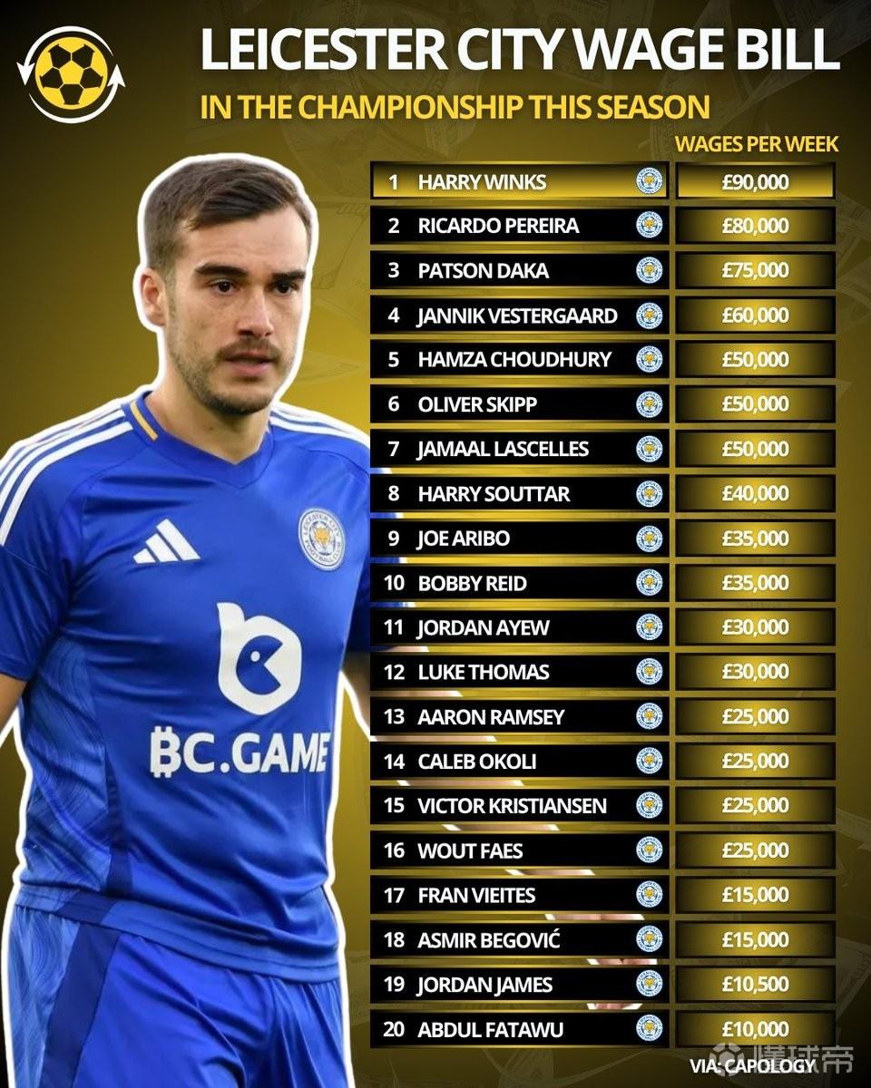 北京時間4月23日,在萊斯特城提前降入英甲的情況下,Capology統(tǒng)計出了藍(lán)狐本賽季隊內(nèi)20名球員的周薪,溫克斯9萬英鎊最高,20人合計周薪超過了77萬英鎊。