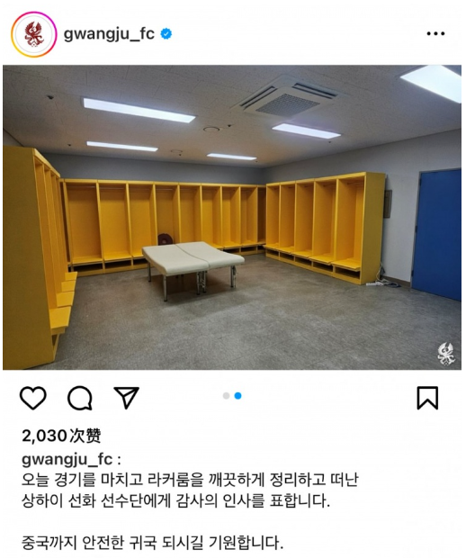光州FC感謝申花清理更衣室並祝福球隊平安返程