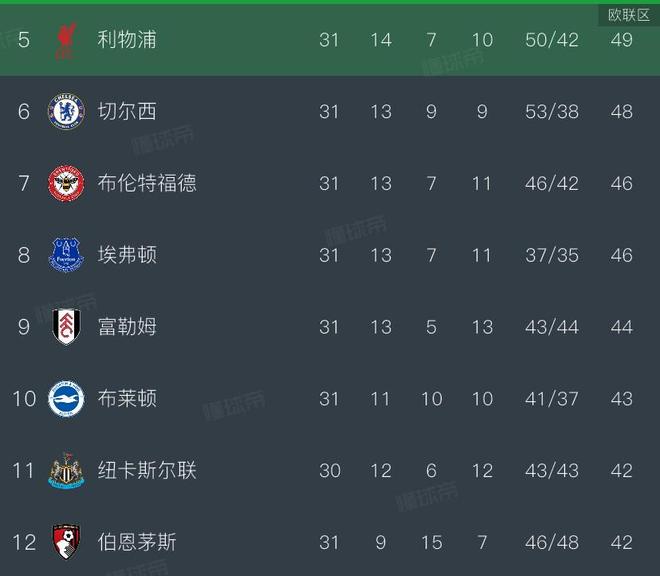 英超前31輪過后,利物浦積49分排名第五,切爾西48分第六,在他們身后的則是同積46分的布倫特福德和埃弗頓。此外如果本輪紐卡能夠在主場拿下桑德蘭,他們的積分也會來到45分。