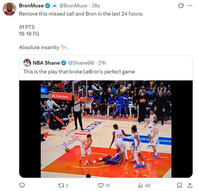 湖人媒體:如果不算申京那個(gè)犯規(guī)沒(méi)有吹罰的未進(jìn)球,詹姆斯在短短24小時(shí)內(nèi)是一波18中18,這實(shí)在是太瘋狂瞭,GOAT。