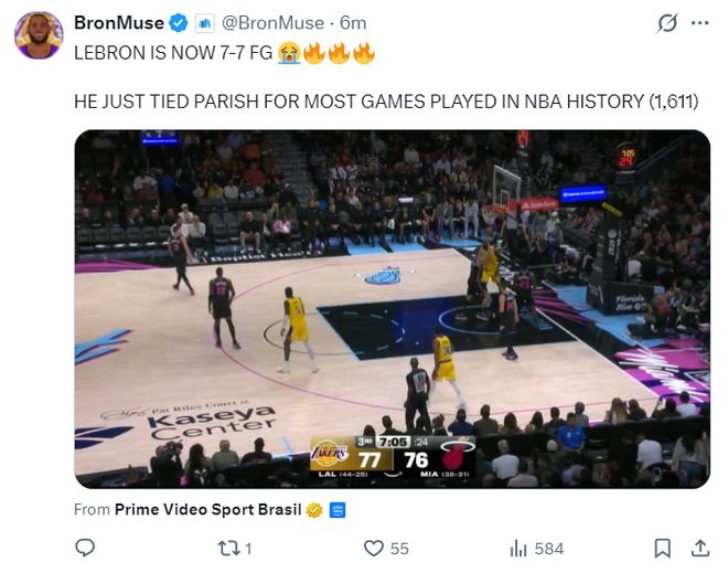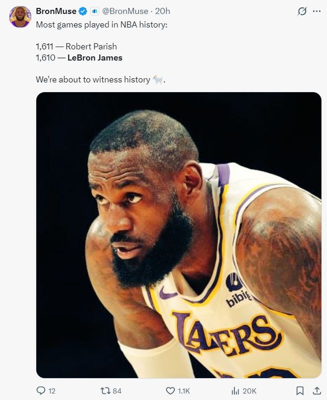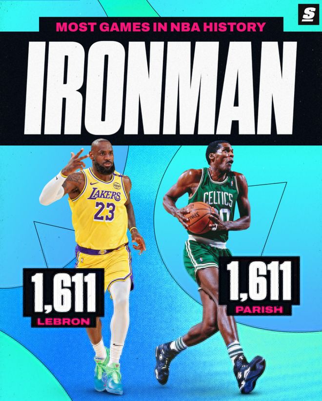 昨夜勒佈朗在面對(duì)火箭的比賽中14中13+三分2中2拿到30分一戰(zhàn)刷新多項(xiàng)紀(jì)錄,41歲的老將此役決定出戰(zhàn)背靠背後他生涯登場(chǎng)數(shù)1611場(chǎng)追平瞭帕特裡什並列歷史第一,這位歷史最長(zhǎng)的河繼續(xù)創(chuàng)造歷史。
