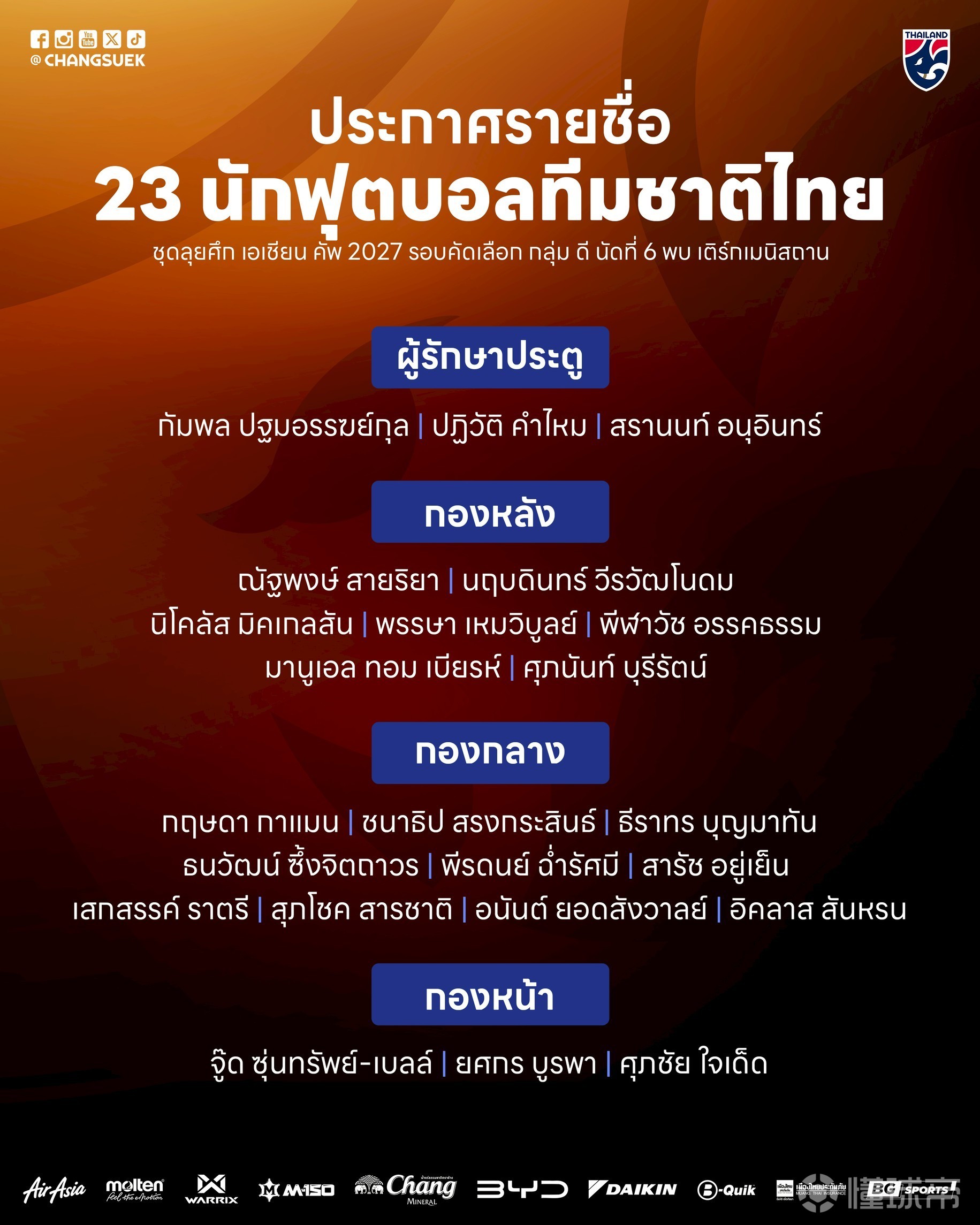 泰國公布了3月參加亞洲杯預(yù)選賽的23人名單,其中德乙球員米克爾森在列,3名海外球員入選。