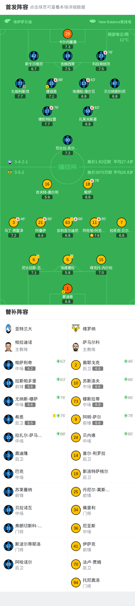 第38分鐘,扎帕科斯塔內(nèi)切打門,皮球直掛死角,亞特蘭大1-0維羅納
