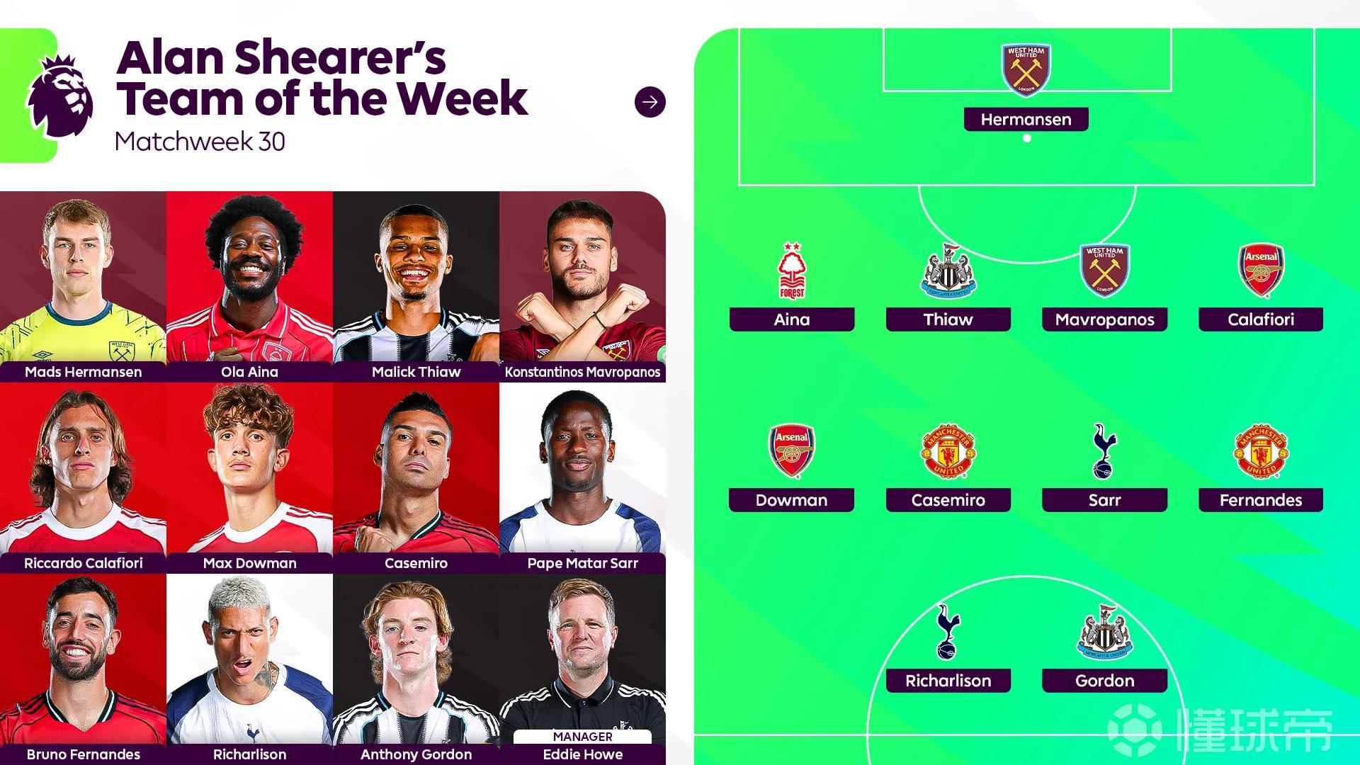 英超第30輪戰(zhàn)罷,英超官方公布了阿蘭-希勒評選的本輪最佳陣容,布魯諾-費(fèi)爾南德斯、道曼、里沙利松等人在列。
