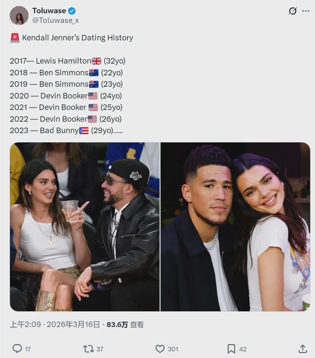 不僅如此,今年1月30日,布克跟詹娜曾在評論區(qū)曖昧互動。布克寫道:“我壓一百萬,海鷹隊(NFL)比你更早拿到戒指?!边^了十幾分鐘,詹娜回復(fù):“你的腳踝怎么樣了?(白眼的表情)”布克表示:“你來給我揉揉它……”引來不少吃瓜群眾。