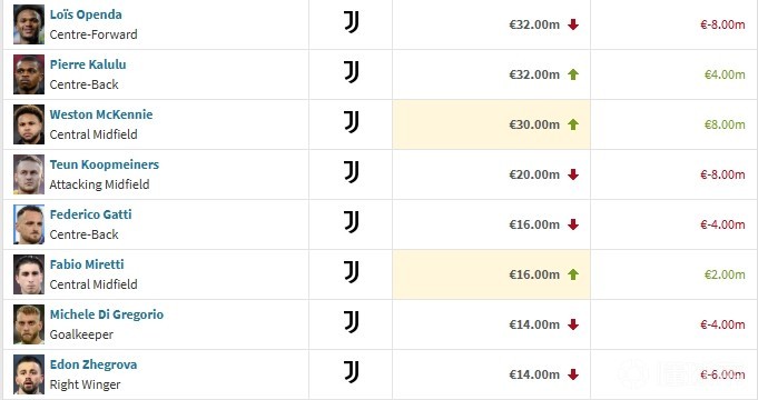 北京時間3月24日,德轉對意甲球員的身價進行了更新,麥肯尼上漲800萬歐,奧蓬達、庫普下跌800萬歐。
