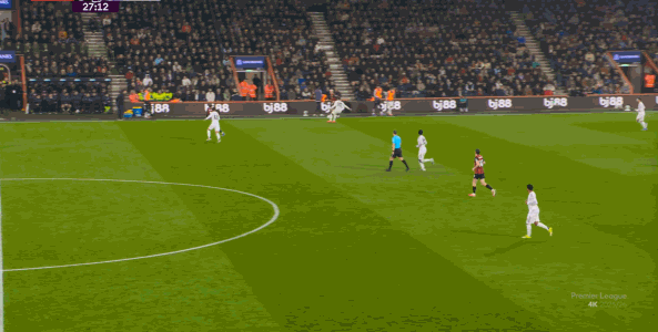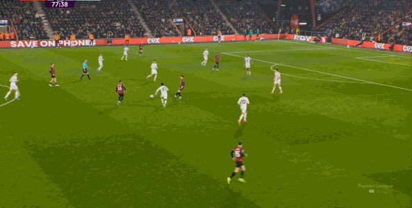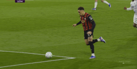 這個(gè)時(shí)候,曼聯(lián)想要打出優(yōu)勢(shì),就需要找其中還能勉力維持的點(diǎn)位,這個(gè)點(diǎn)位就是庫(kù)尼亞,一方面他的確是比較全面,所以身體撐得住技術(shù)的基本發(fā)揮,另一方面就是他對(duì)位的伯恩茅斯右后衛(wèi)阿萊士-希門尼斯比較弱,所以在這個(gè)一對(duì)一里,曼聯(lián)可以打出優(yōu)勢(shì),從而形成局勢(shì)上的平衡,甚至是反超: